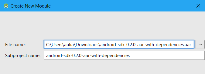 - Pilih file .aar yang telah diunduh, kemudian klik finish