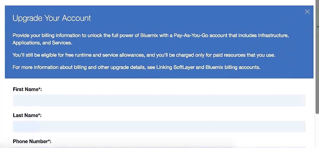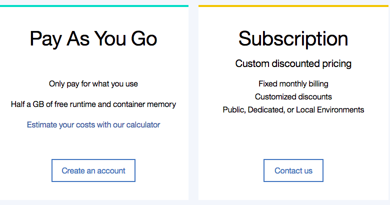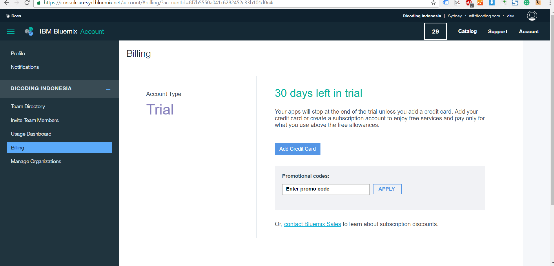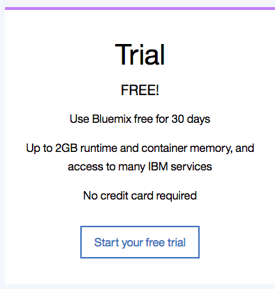 Bagi Anda yang pertama kali menggunakan Bluemix, setelah melakukan registrasi, disediakan layanan free trial selama 30 hari. Selama masa free trial ini, Anda mendapatkan layanan runtime dan memori kontainer sampai dengan 2 GB, akses ke 10 layanan Bluemix lainnya tanpa memerlukan pembayaran dengan kartu kredit, dan mendapatkan 1 sertifikat SSL.