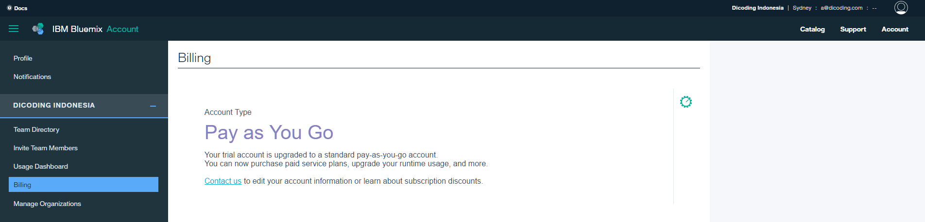 Setelah melewati batas free trial, aplikasi di akun Anda dihentikan. Namun, Anda masih dapat mengakses akun. Anda dapat memilih jenis account dan hanya membayar layanan dengan model Pay-As-You-Go (membayar apabila penggunaan lebih dari batas standar).