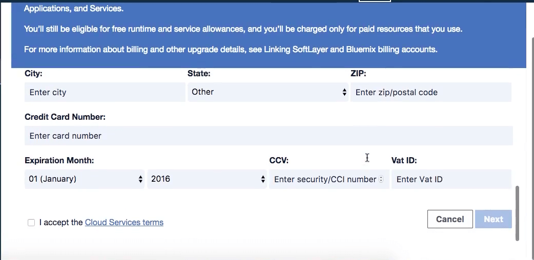 - Selanjutnya lengkapi data profil anda dan masukkan nomor kartu kredit Anda. Jangan lupa mencentang I accept the Cloud Services terms, kemudian klik Next.