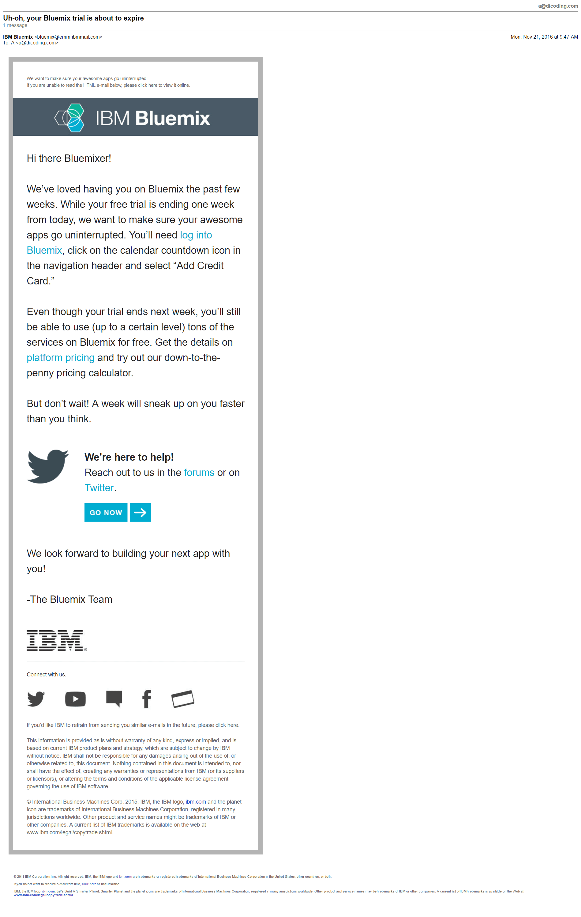 Jika Anda tidak mengupgrade akun setelah free trial berakhir, Anda akan menerima notifikasi email tentang status akun Anda setelah trial berakhir. Notifikasi sebagai pengingat untuk membuat akun berbayar Anda sehingga pengaturan dan konfigurasi aplikasi anda tidak akan hilang. Jika tidak ingin menerima notifikasi ini dari Bluemix, Anda dapat berhenti berlangganan setiap saat. Satu bulan setelah berakhirnya trial, aplikasi dan konfigurasi layanan dihapus.