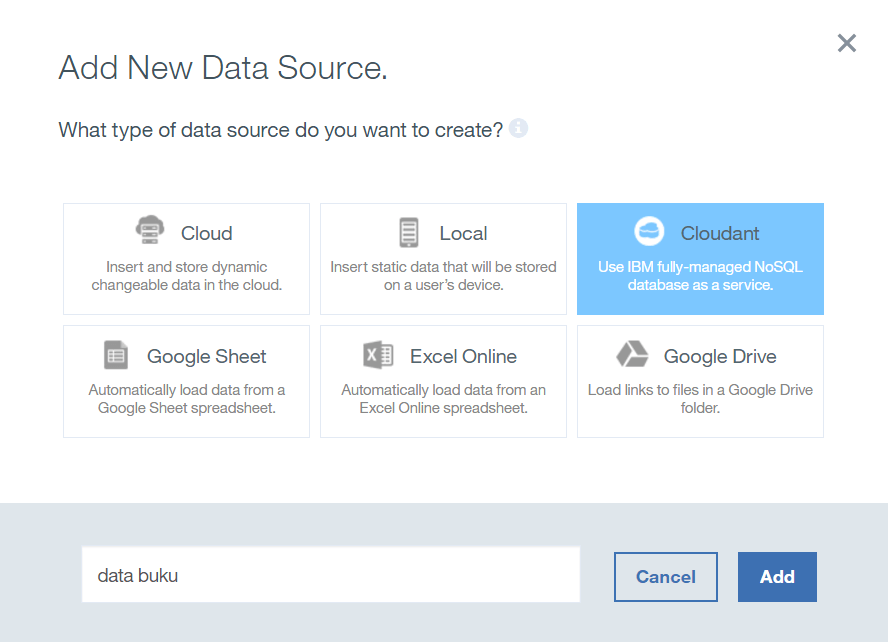 - Klik New Data Source kemudian pilih Cloudant DB, kemudian beri nama data, misalnya “data buku”