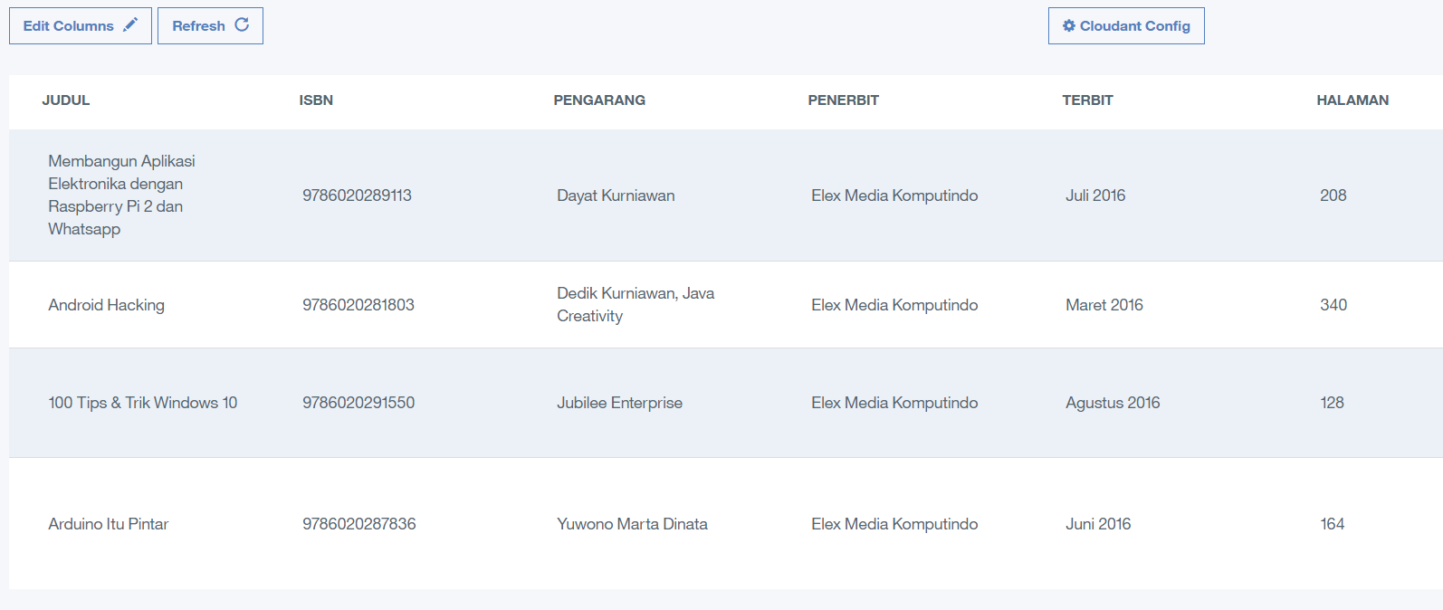 - Jika konfigurasi credentials berhasil, akan ditampilkan data yang ada pada Cloudant DB