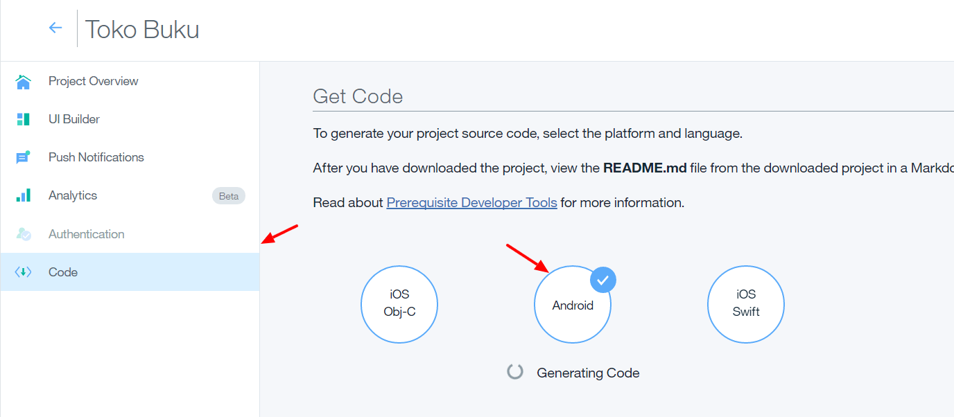 - Pilih menu Code kemudian pilih platform yang tersedia, misal Android.