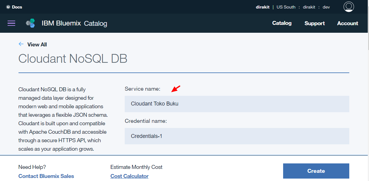 - Beri nama service yang akan dibuat, kemudian klik Create