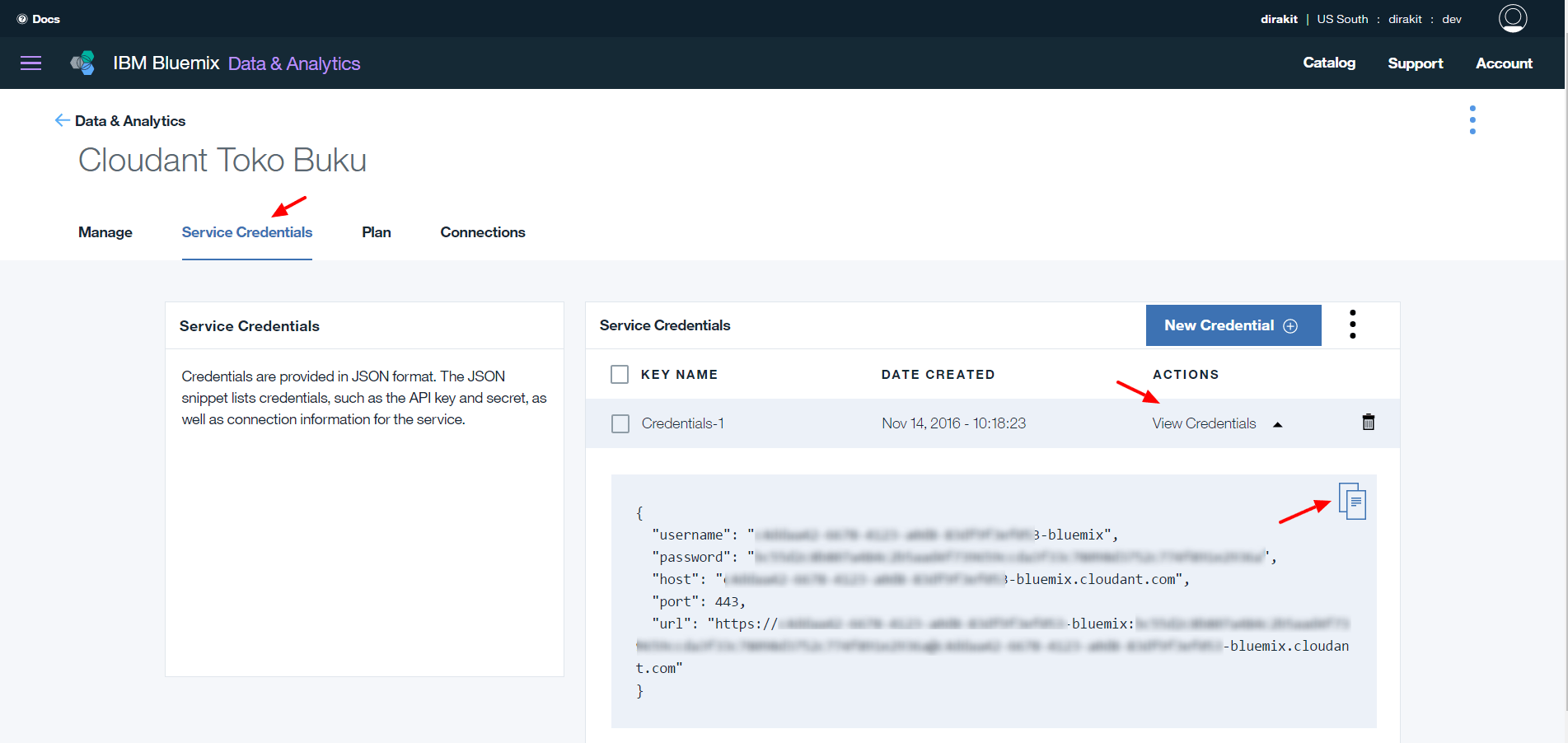 - Masukkan info credentials dari Cloudant yang telah dicatat sebelumnya