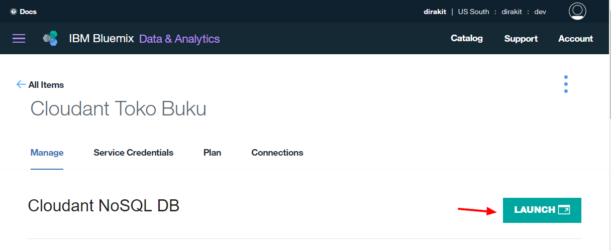 - Kembali ke tab Manage, klik Launch untuk membuka dashboard Cloudant DB