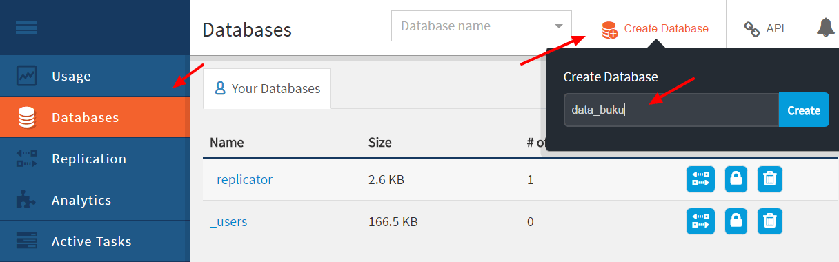 - Pilih Database pada side menu, kemudian klik Create Database pada top menu